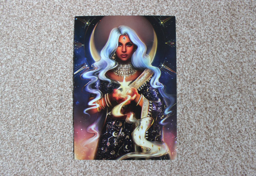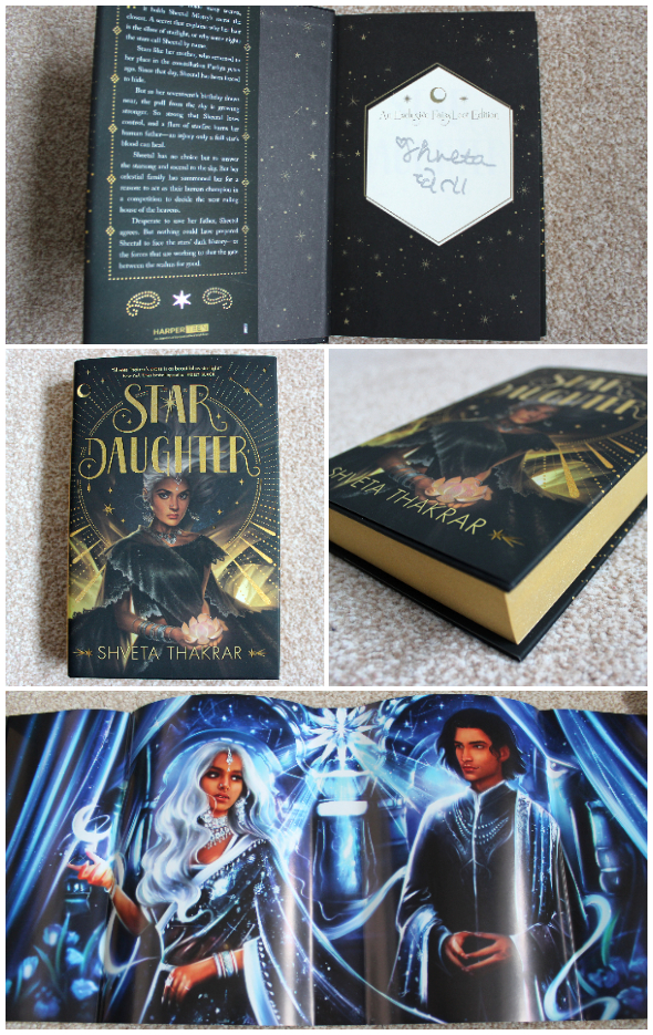 The featured book of the month is Star Daughter by Shveta Thakrar! This exclusive edition has shimmery sprayed edges, artwork on the reverse of the dust jacket by @bxromance and is signed by the author. There is also artwork on the back of the author letter but it doesn’t say on the spoiler card who the artwork is by.