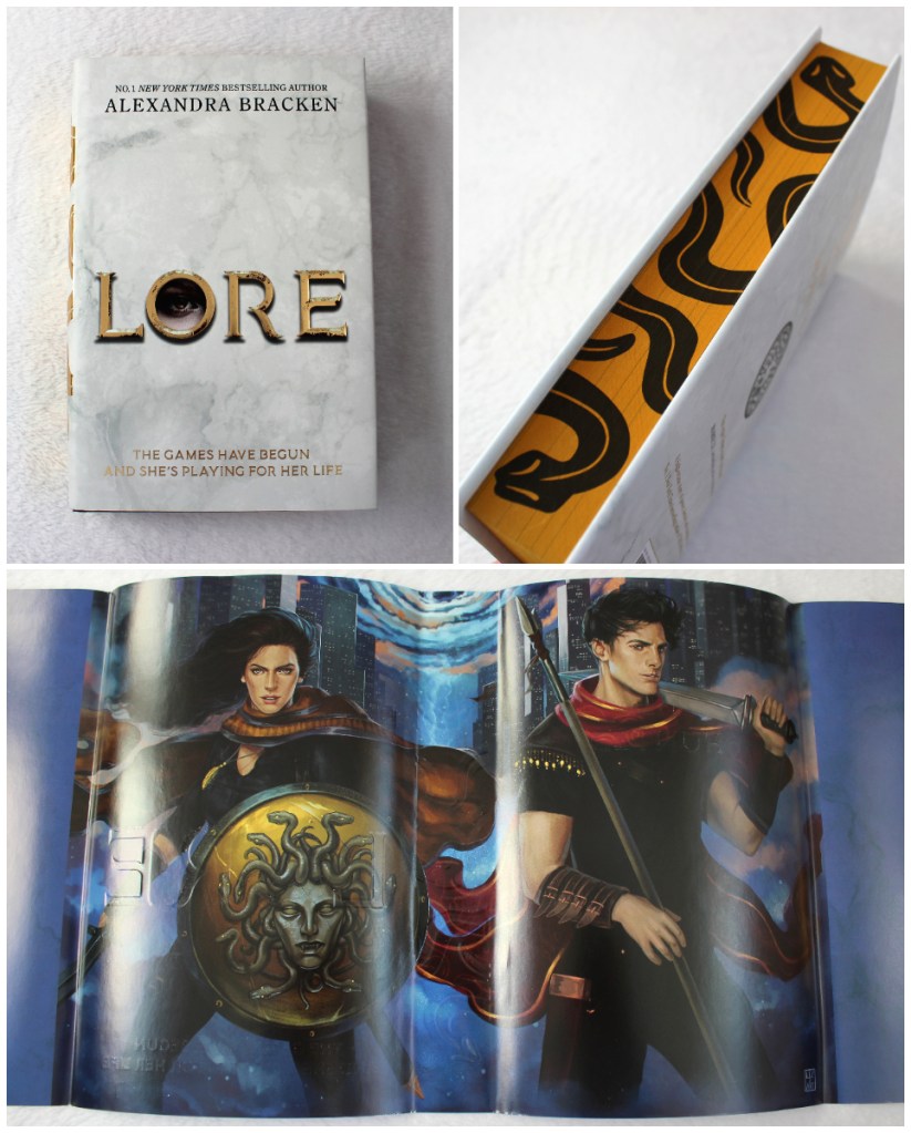 The book of the month is Lore by Alexandra Bracken. This edition has an exclusive cover, sprayed and stencilled edges, artwork on the reverse of the dust jacket by @lizzart_zardonicz, foil embossing on the front and back of the case, custom endpapers and a printed signature. There’s also an author letter with character art by @runningquill_art. They really went all out with the special finishes for this book! I love the gold snake on the spine and the embossing on the hardcover. I think the sprayed edges are supposed to be gold but they’ve come out in a strange yellow colour that I wasn’t super keen on at first but have got used to.