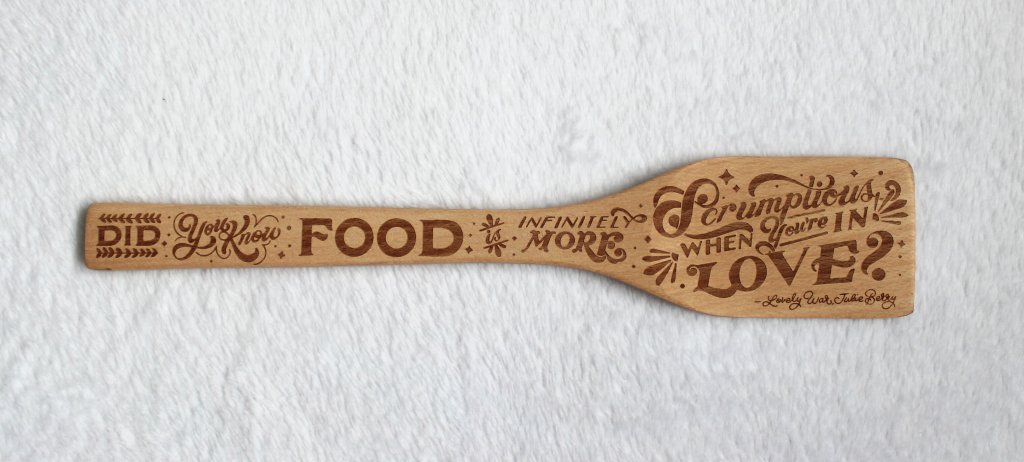 Wooden spatula designed by @kdpletters – The quote is from Lovely War by Julie Berry which I haven’t read. But I guess spatulas are useful!